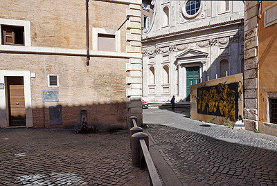 Marge walking towards Tom’s apartment – Via Funari at Piazza Lovatelli, Rome, Italy. The Church of Santa Caterina dei Funari is seen in the background.