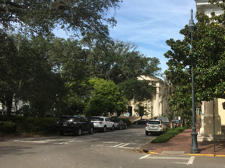 Bull Street at Hull Street, Savannah, Georgia. The feather flies past the Independent Presbyterian Church towards Chippewa Square, with the First Baptist Church visible on the far corner.